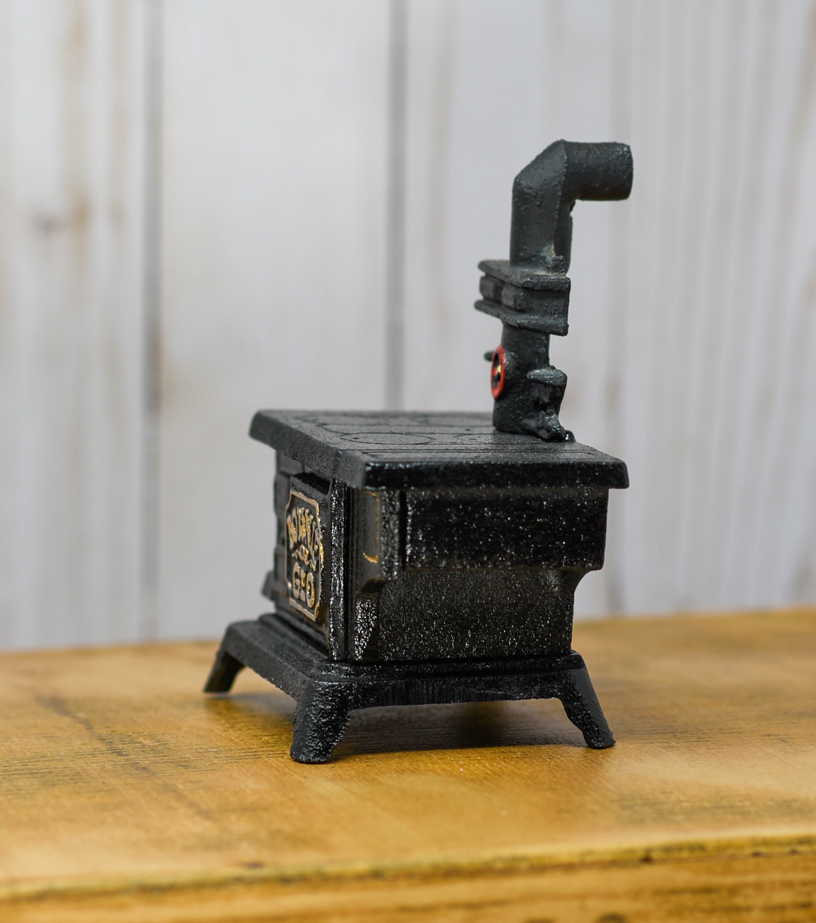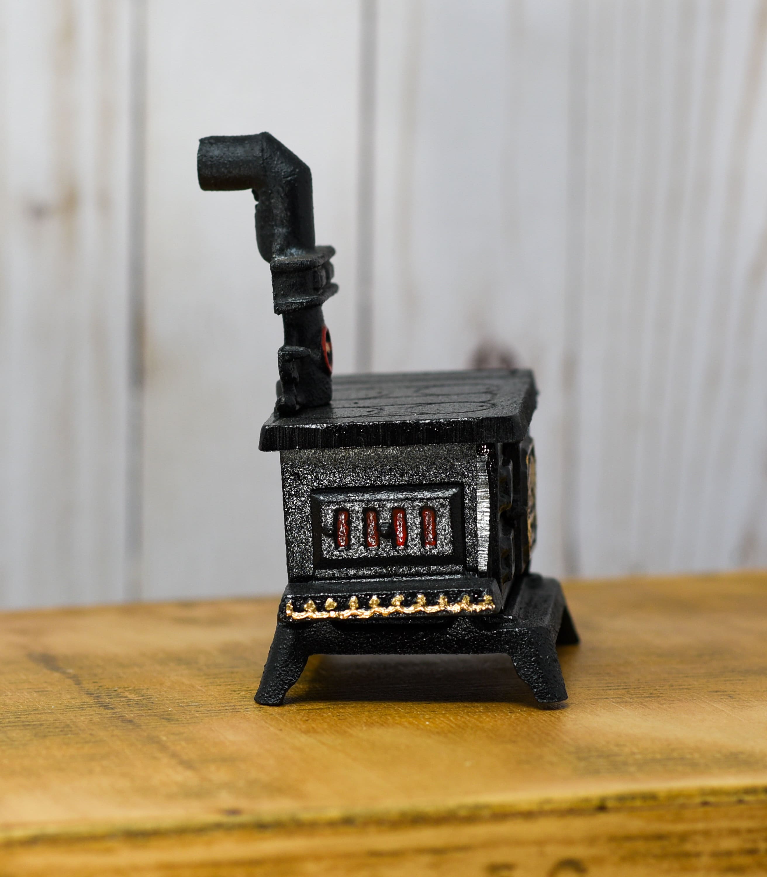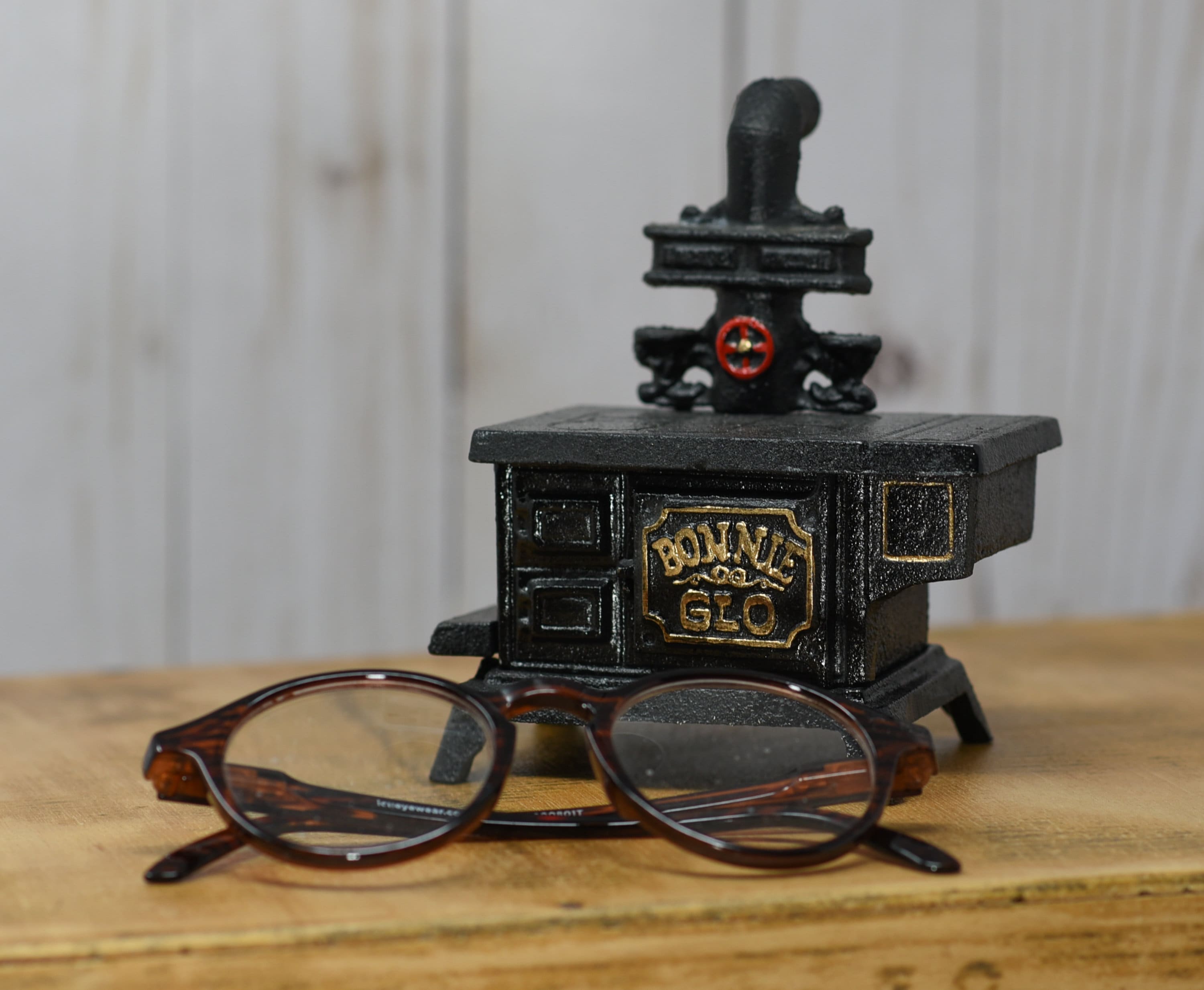 Beautifully refurbish Bonnie Glo cast iron stove. Featuring gold letter on stove door. This stove is a 1:12 or 1 inch scale sized for traditional doll house.
