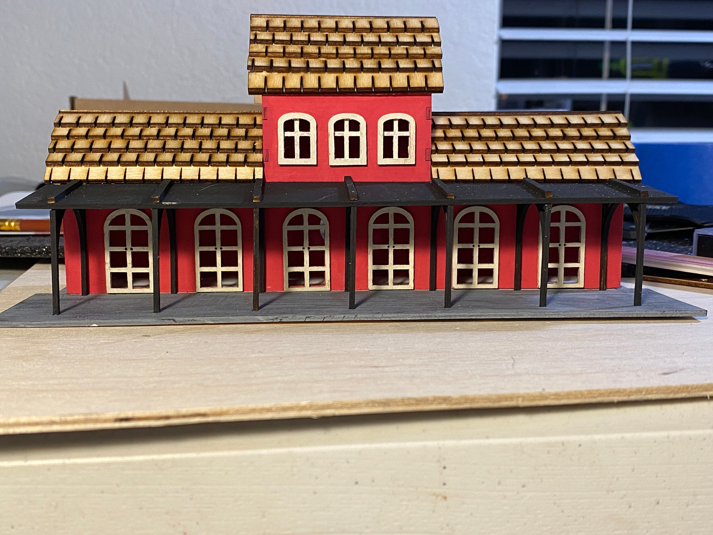 1:160 - N-scale Train station. This station can come completely unassembled or partially assembled. I don't completely assemble it because it would be very difficult to paint. The station is made from 1.5 mm birch plywood.