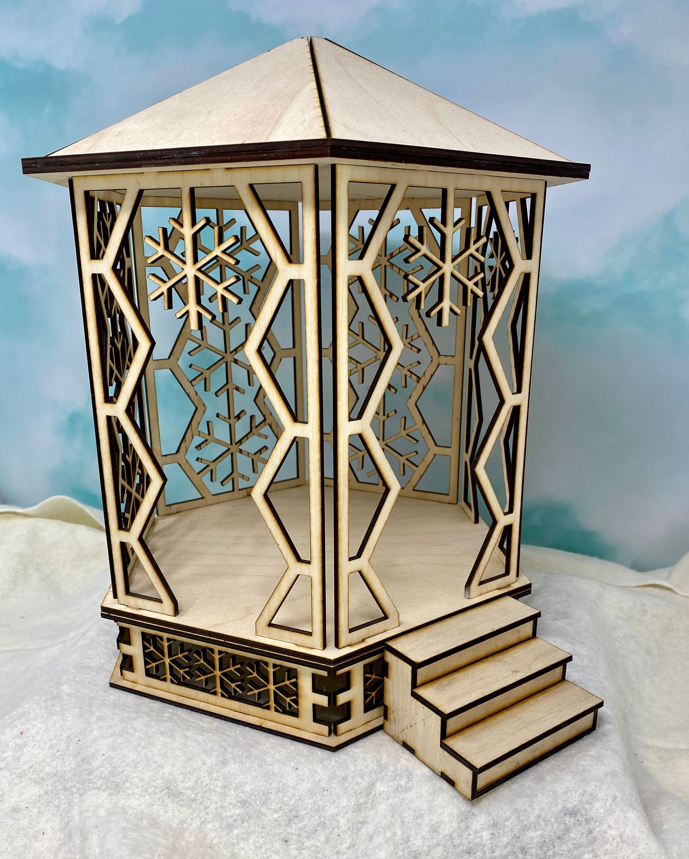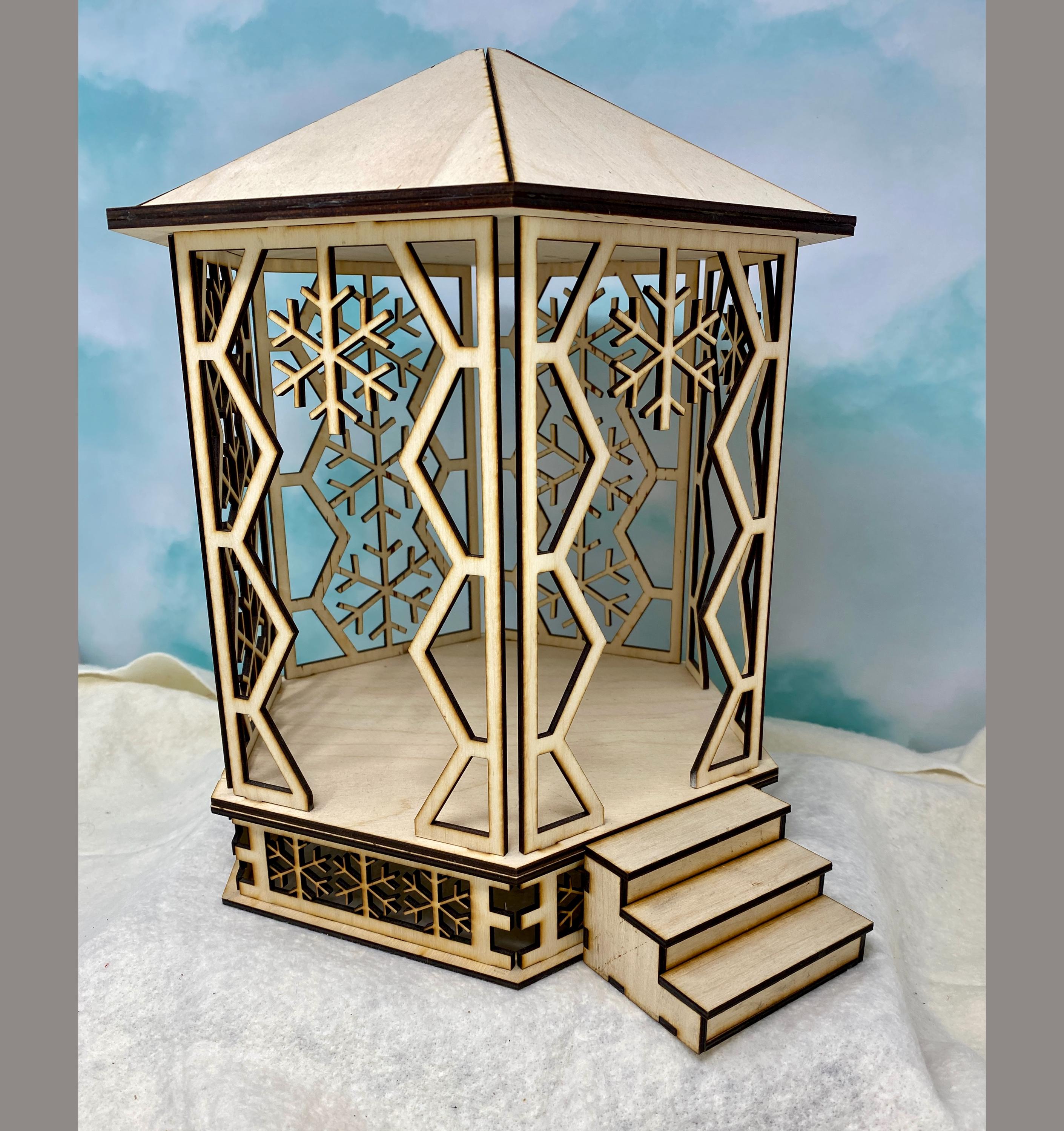 Unfinished 1:12 scale gazebo. This beautiful Winter Gazebo is made from 3mm finish grade Baltic Birch plywood. It can be painted or stained. It is a 3 piece unit. The base, the gazebo and the roof. The roof can be hinged and used to conceal battery pack for lights (not included). Works with 6 - 8 inch dolls.