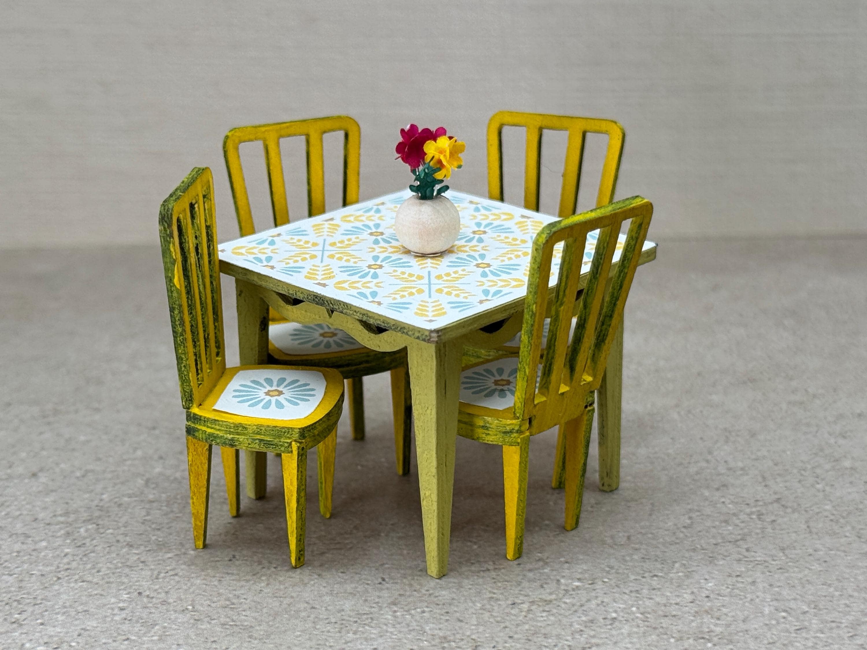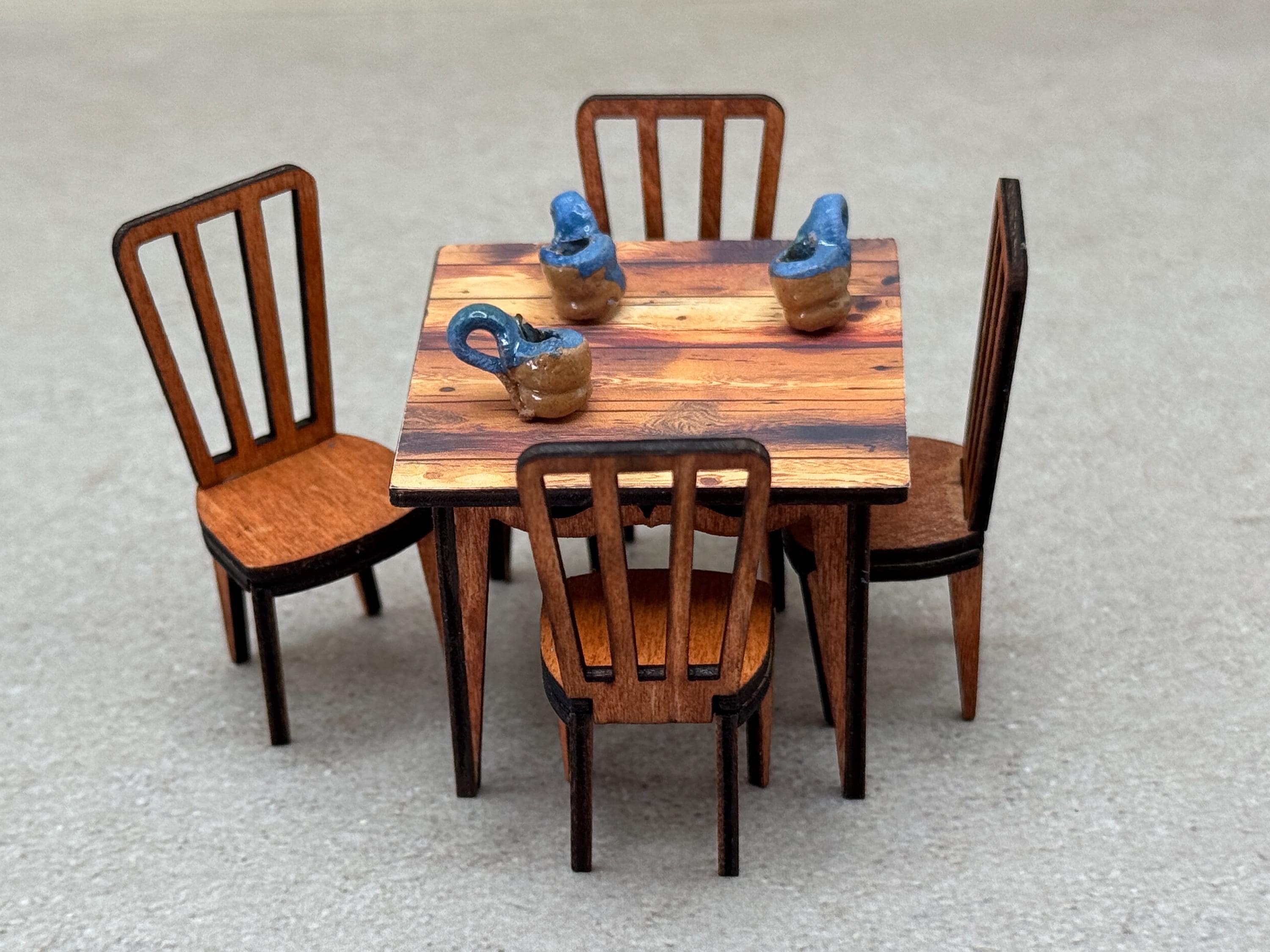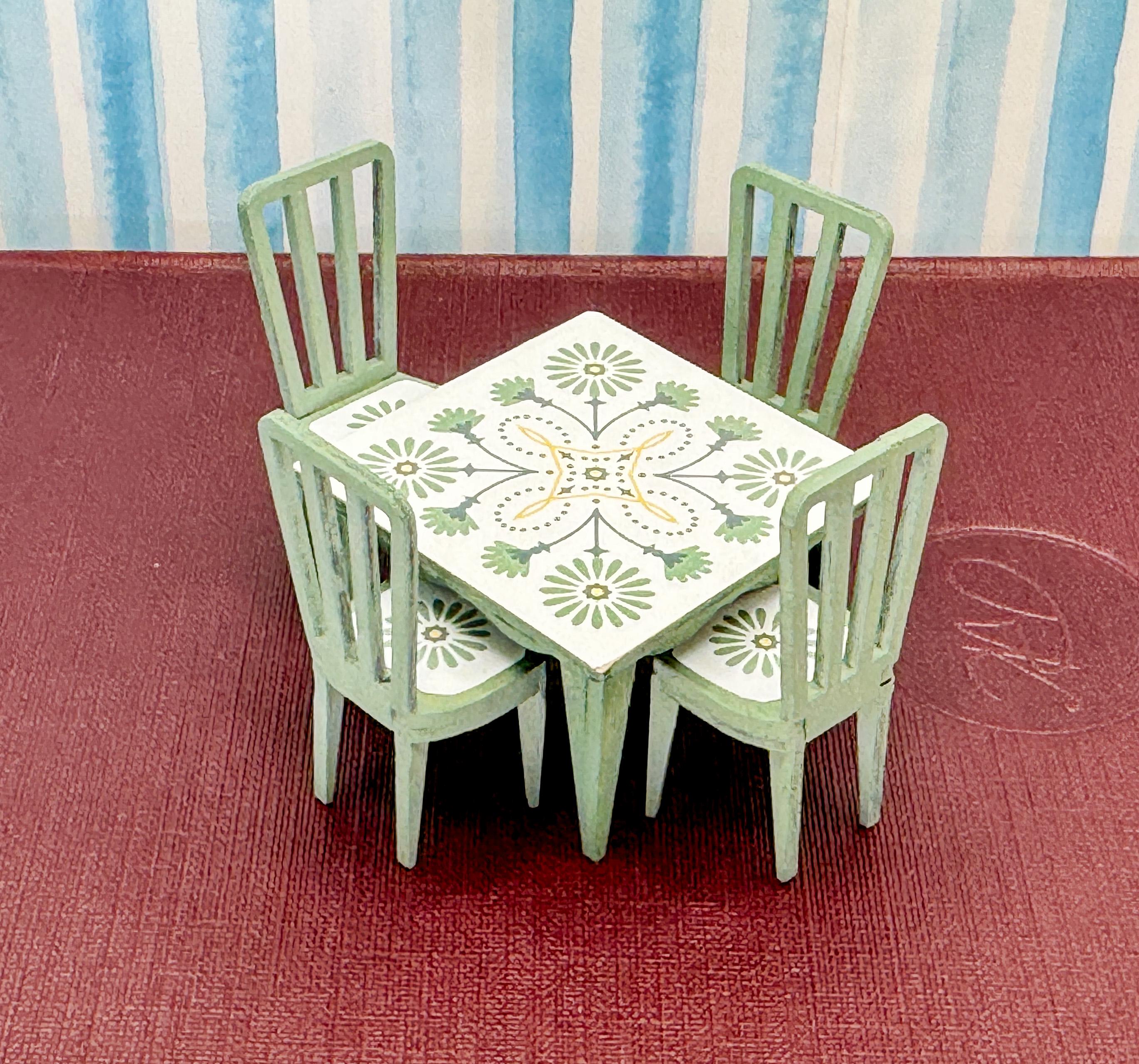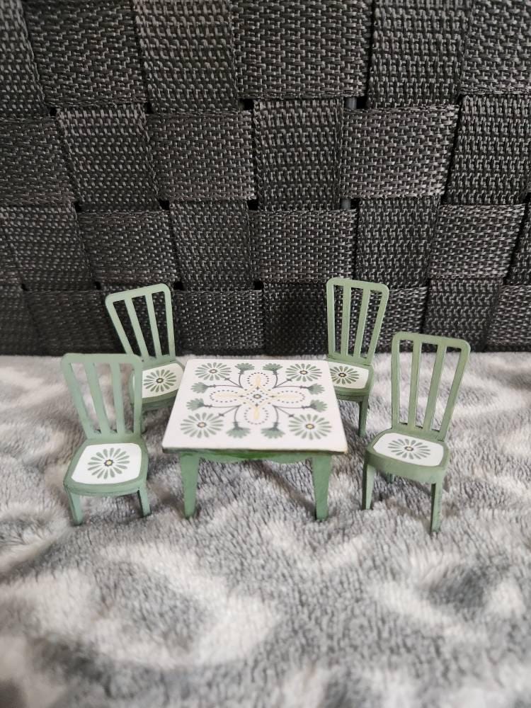 Tiny country kitchen table and 4 chairs. These come finished. The set was deigned by me and is hand finished and are signed and dated on the bottom