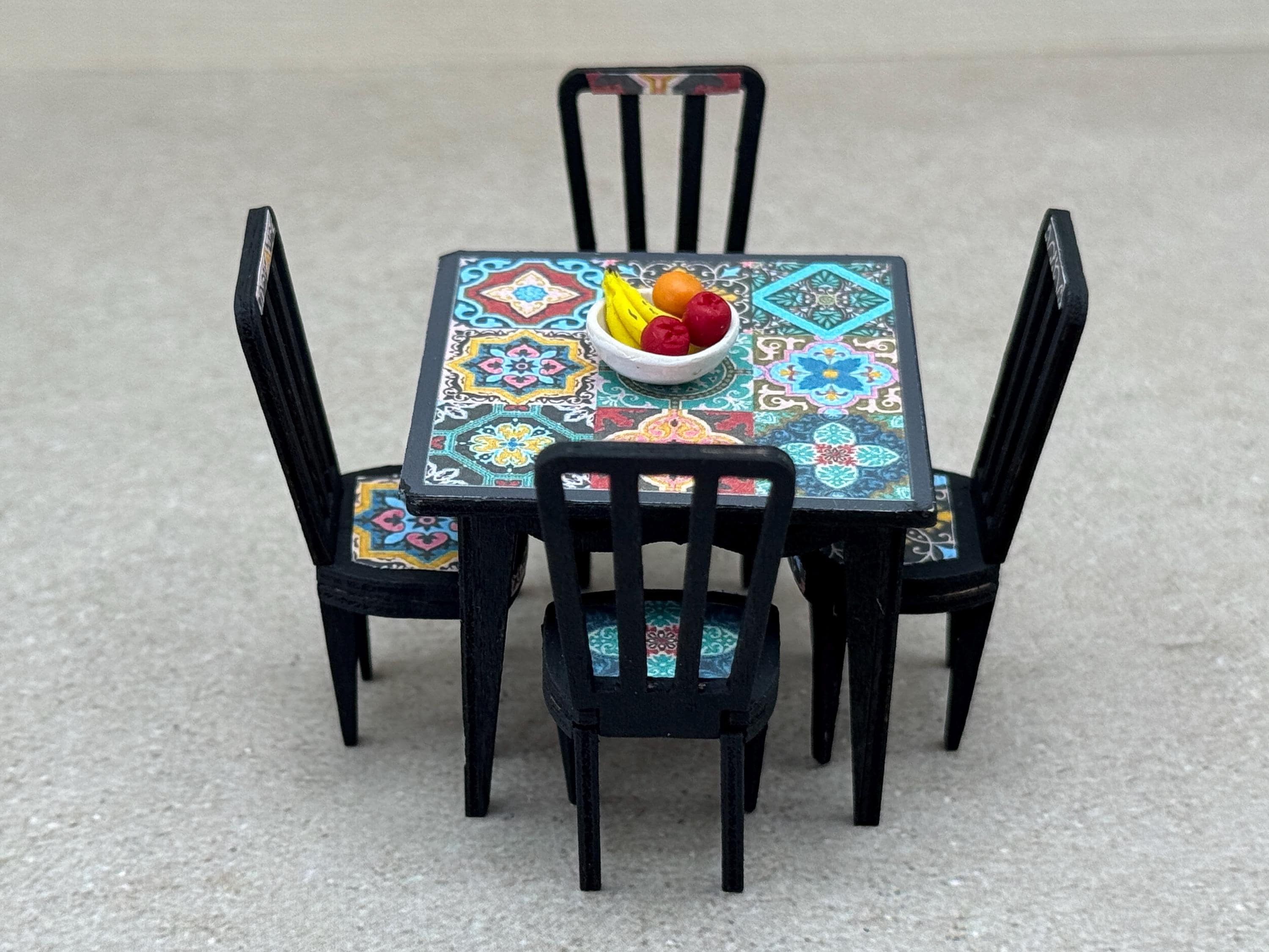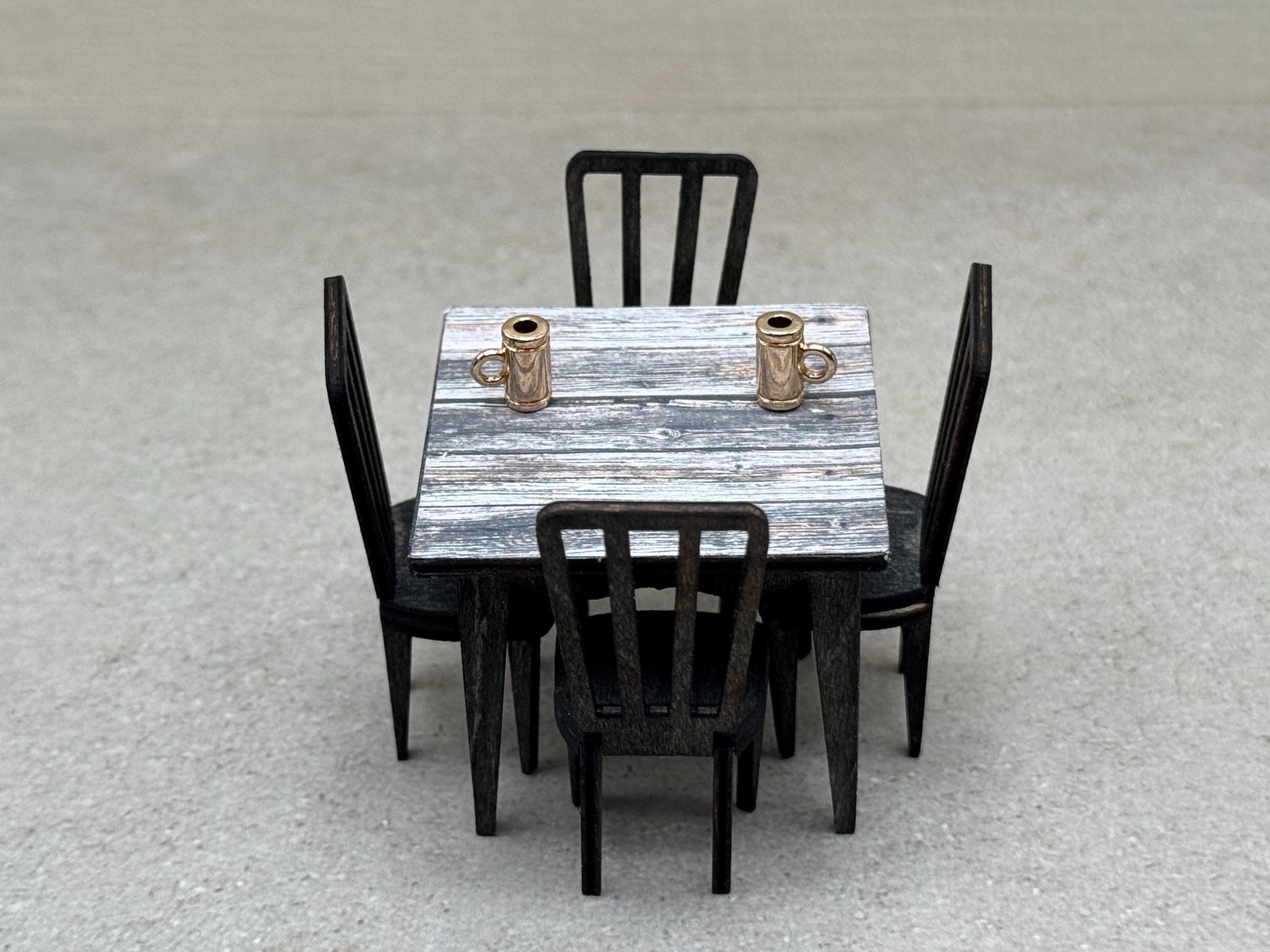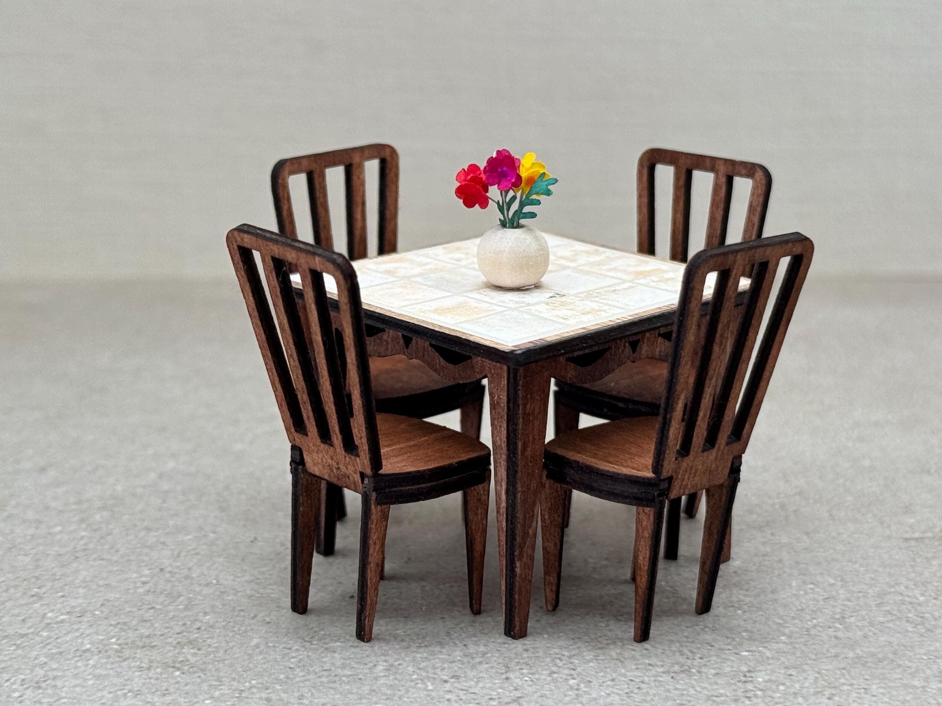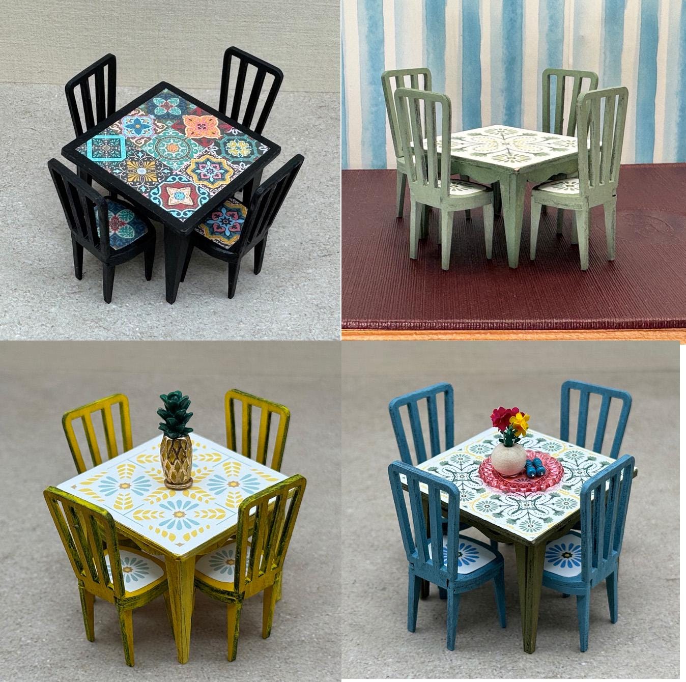 Tiny country kitchen table and 4 chairs. These come finished. The set was deigned by me and is hand finished and are signed and dated on the bottom