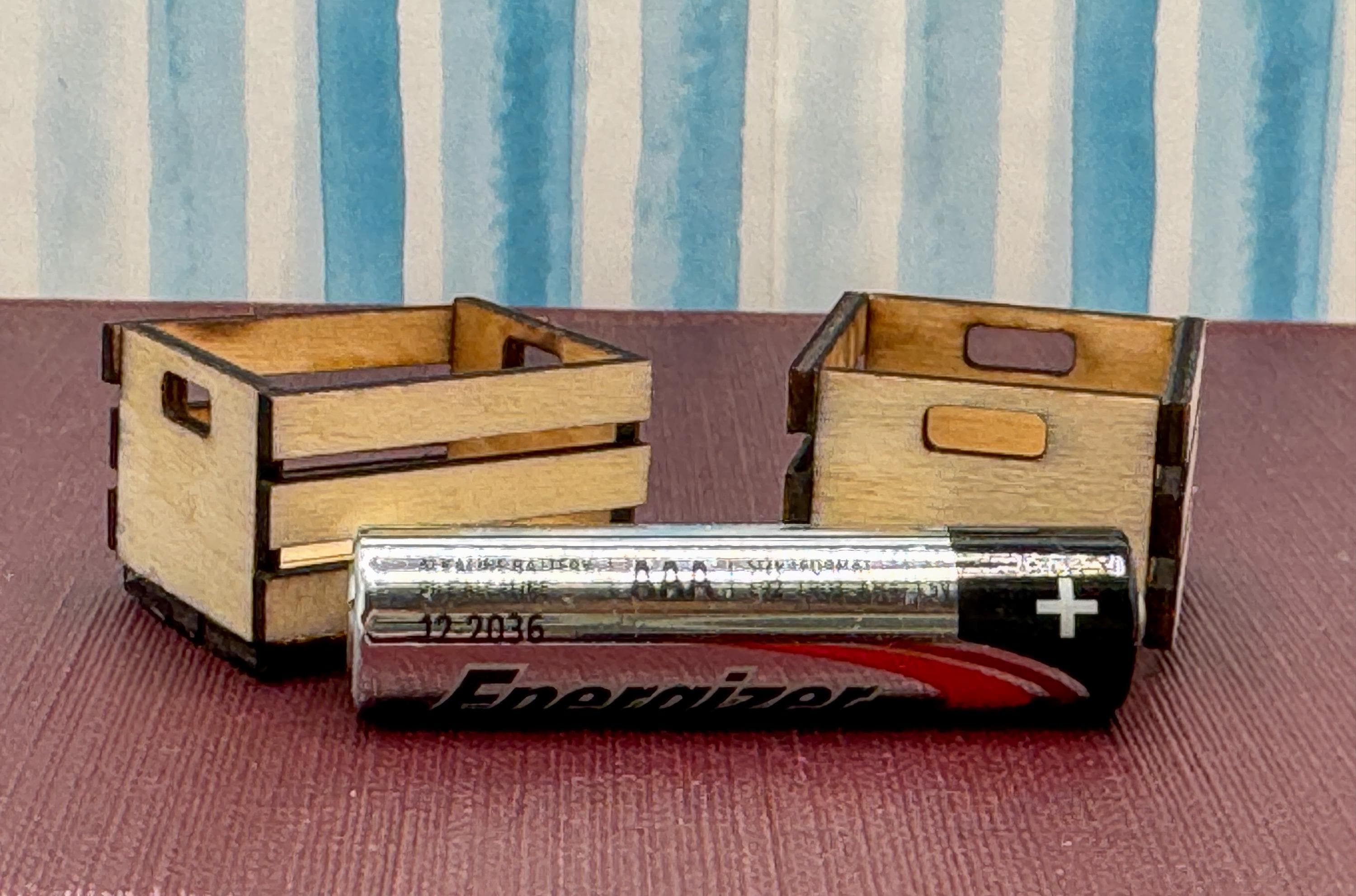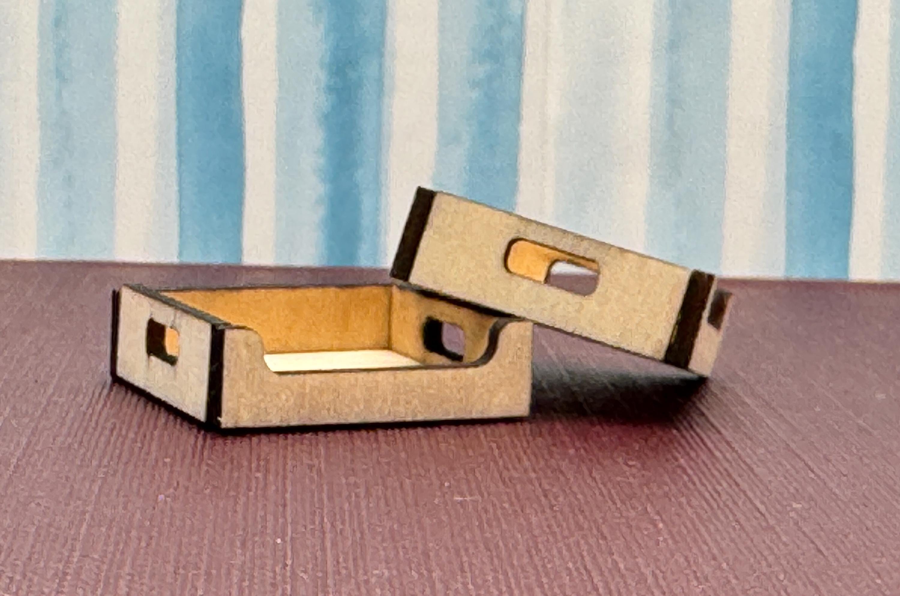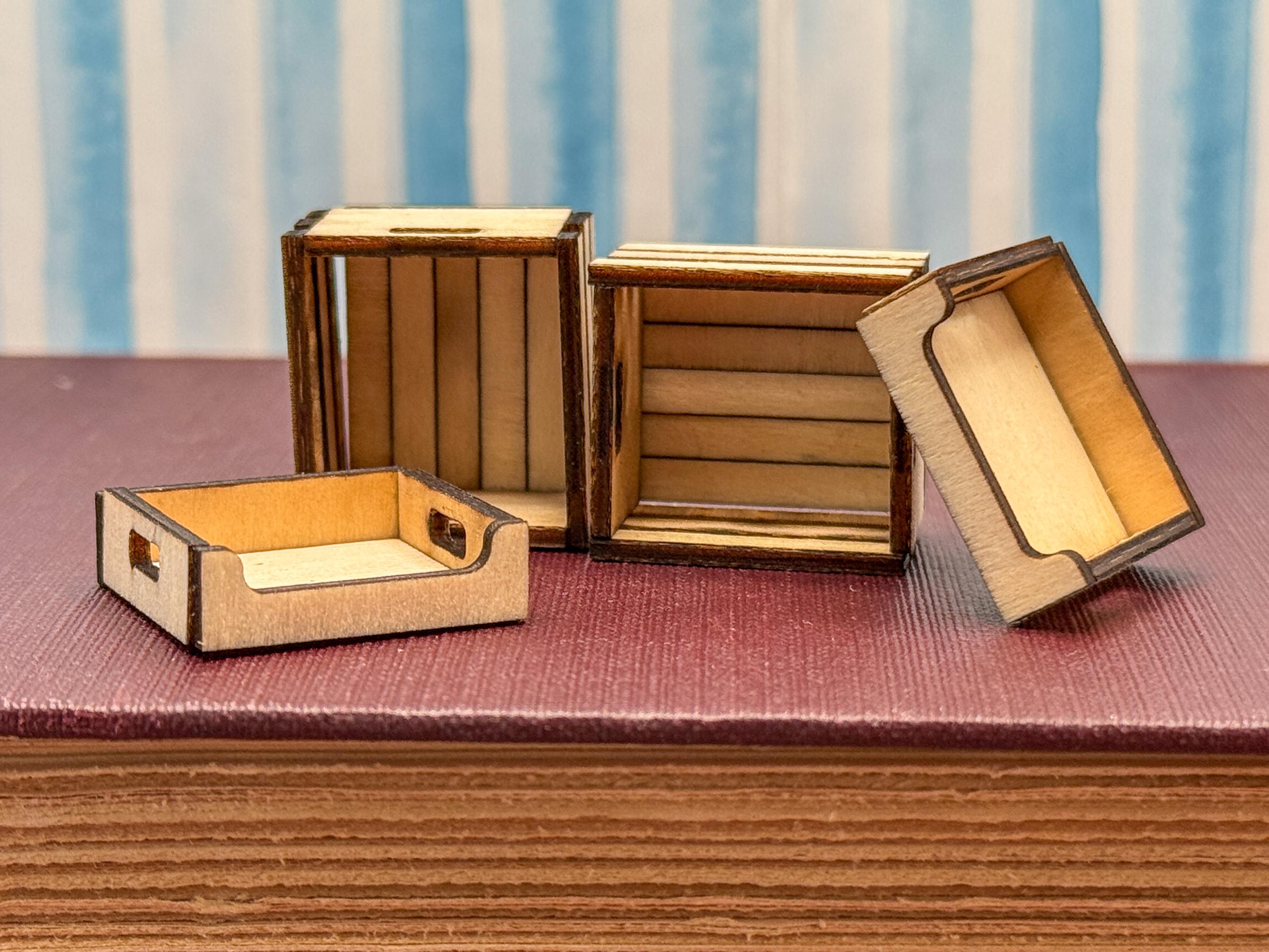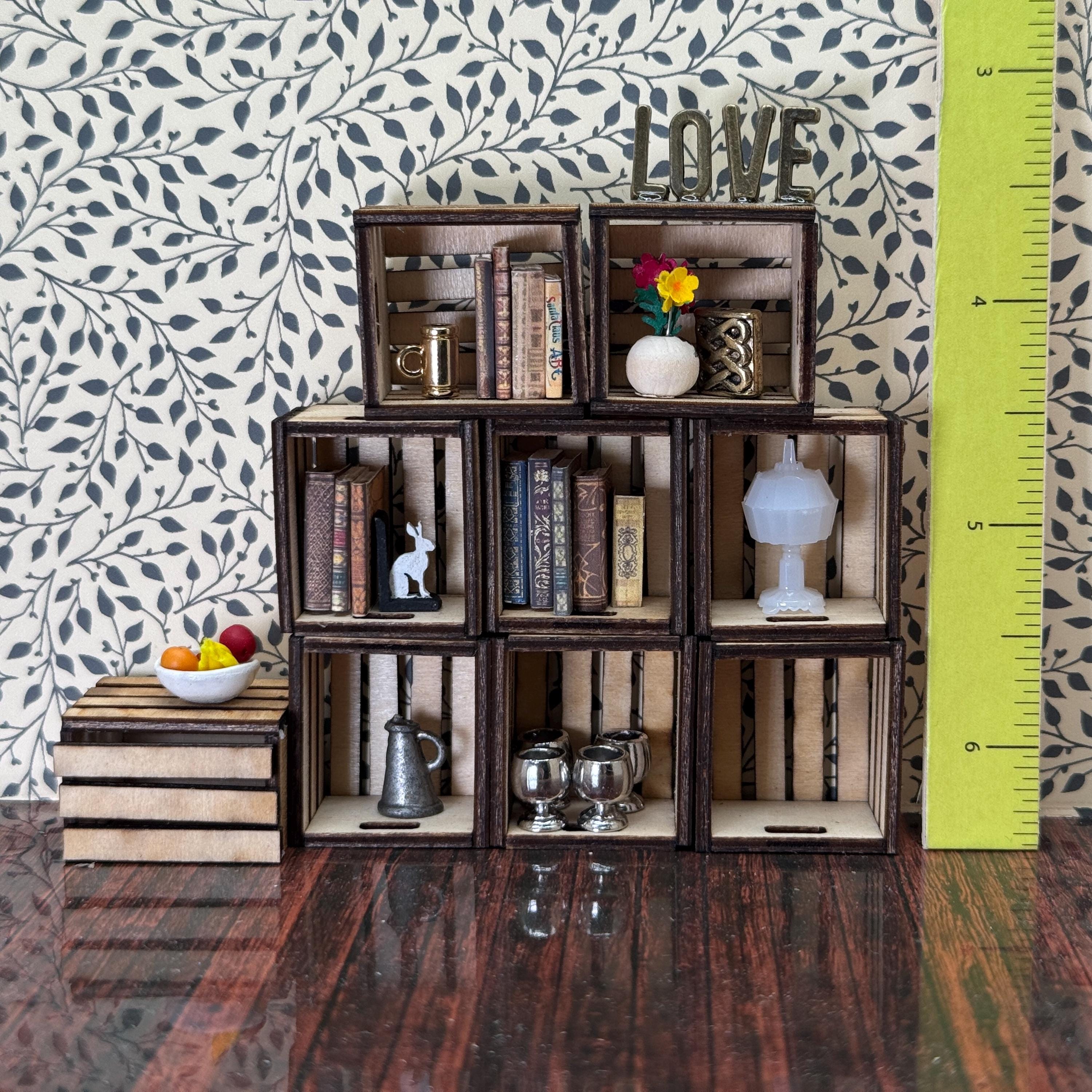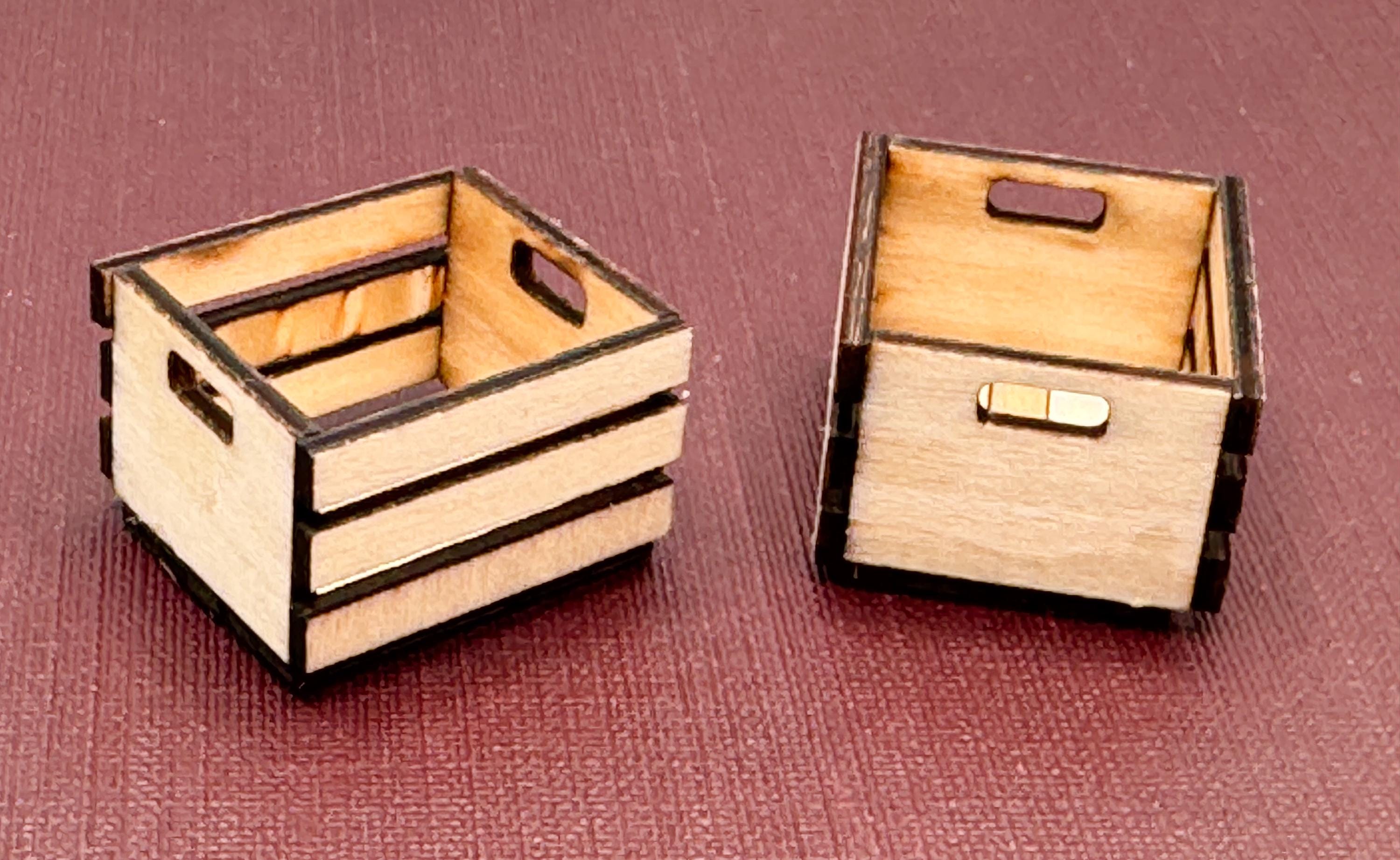 Crates and Trays These mini crates that can be used in your dollhouse stores, kids rooms or for bookshelves. The are handcrafted and made to order. The crates can be left as raw wood, stained or painted. The wood has a aged look due to the laser cutting process. They are shipped assembled (they are really tedious to make - You don't want to do it yourself).