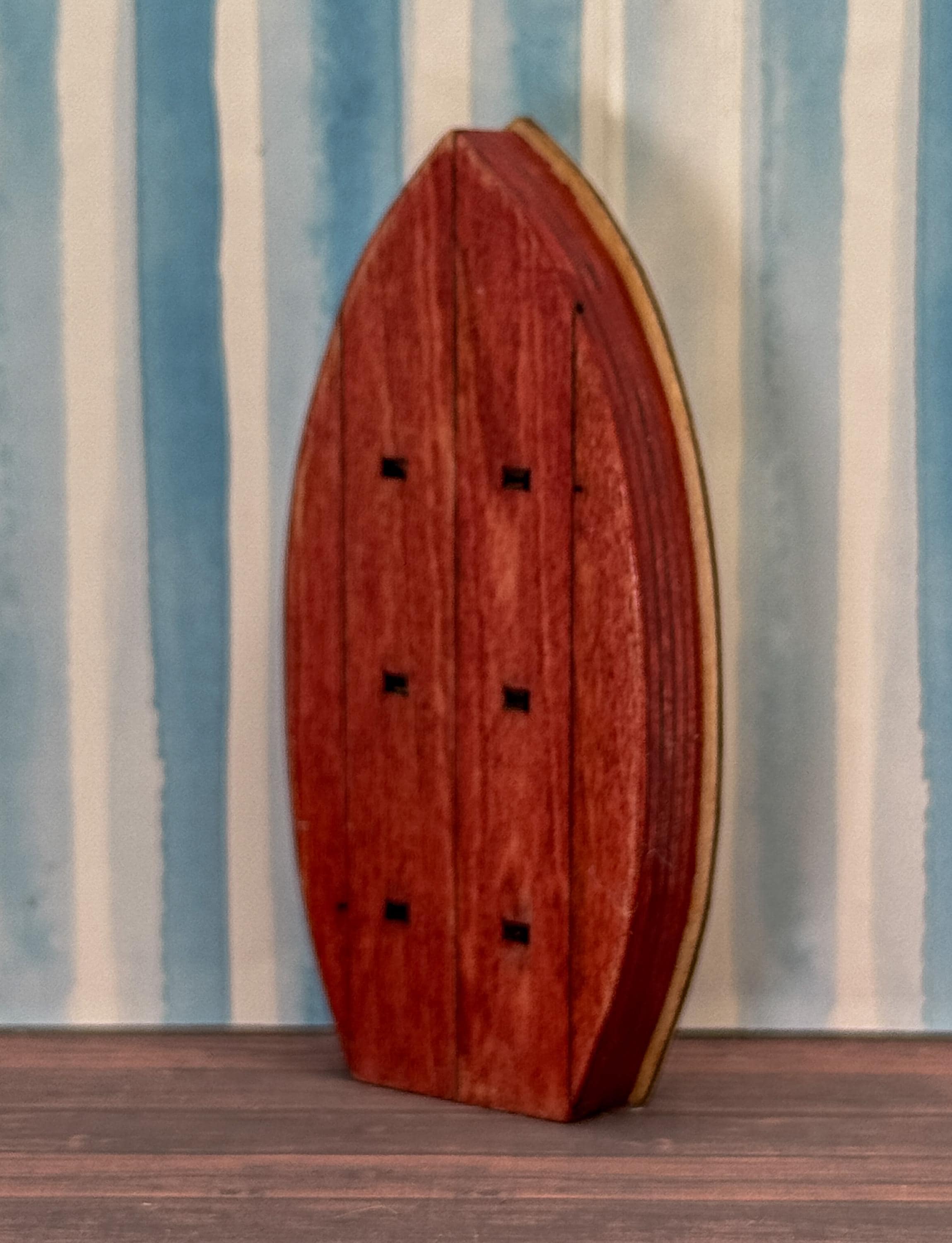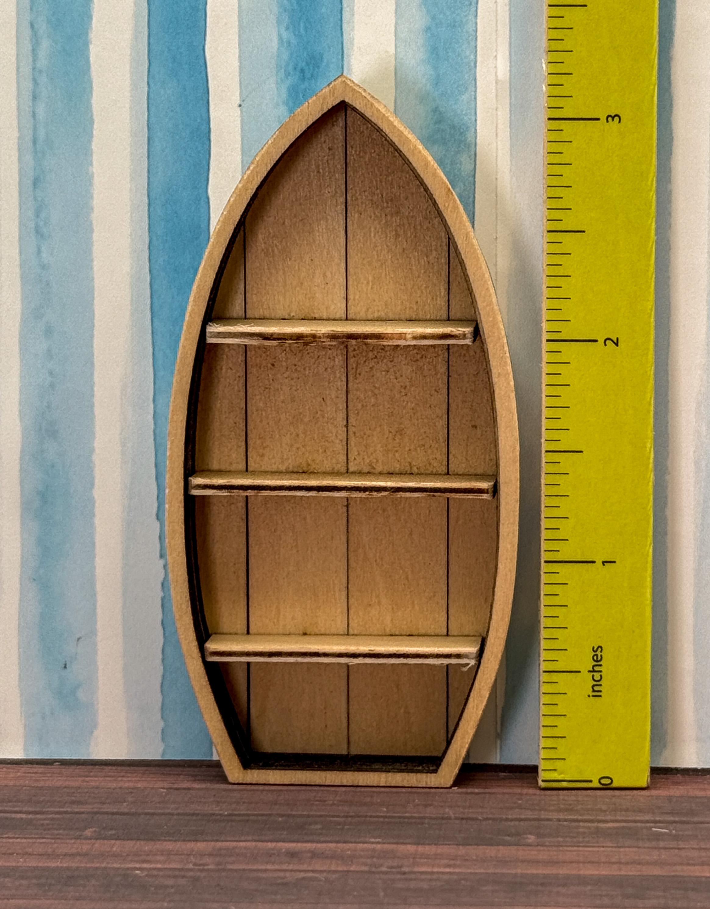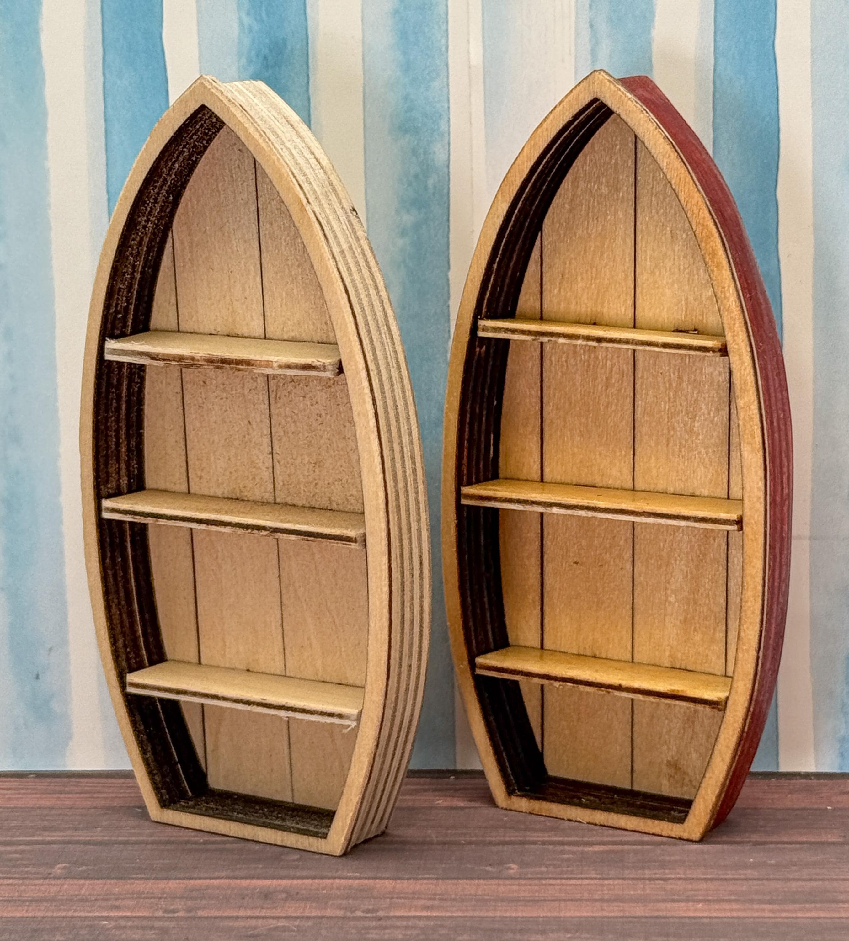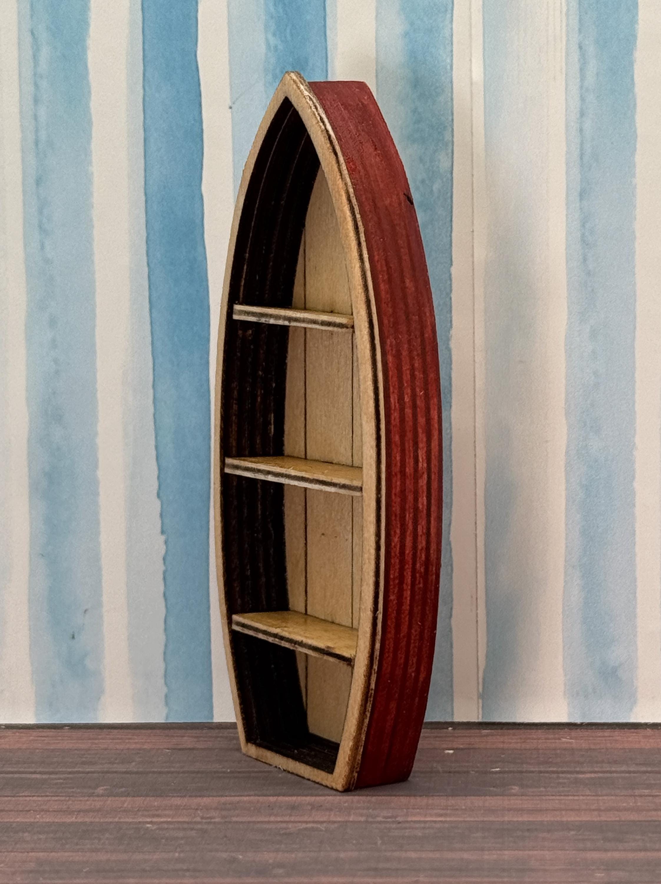 Half inch scale Boat Bookshelf. Perfect for a sea side cottage or a nautical design for a child's room. This charming boat comes unpainted or with a red stained body and clear varnish. The boats are sold or as a set.