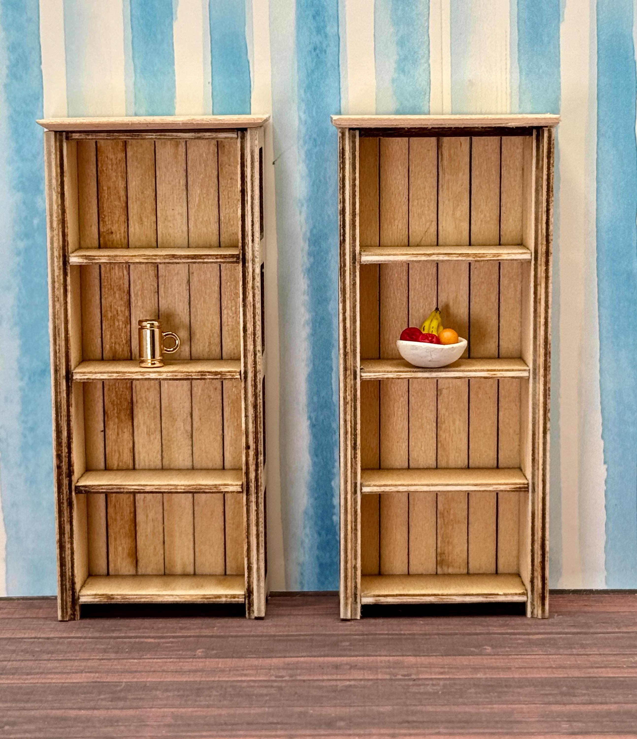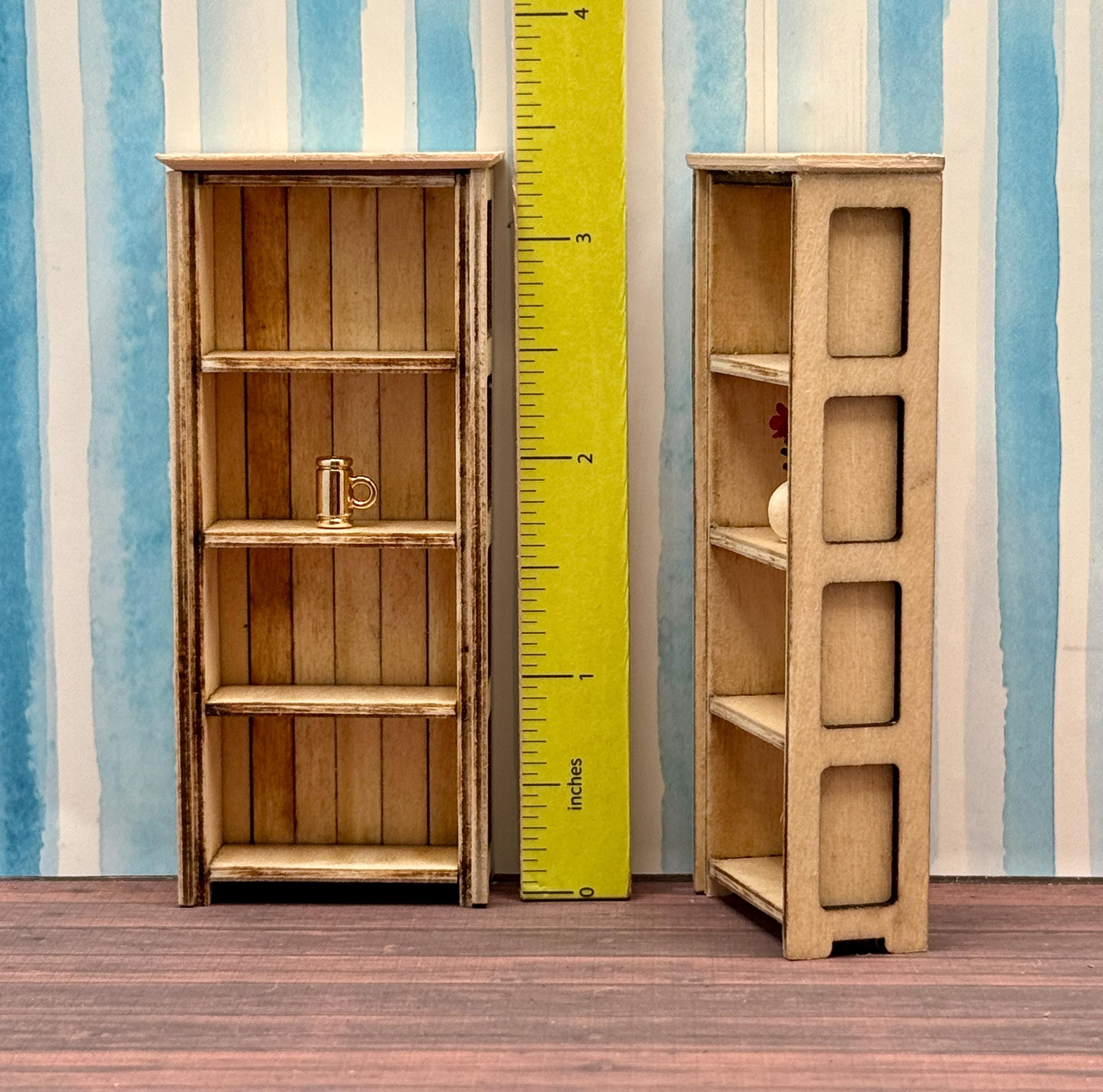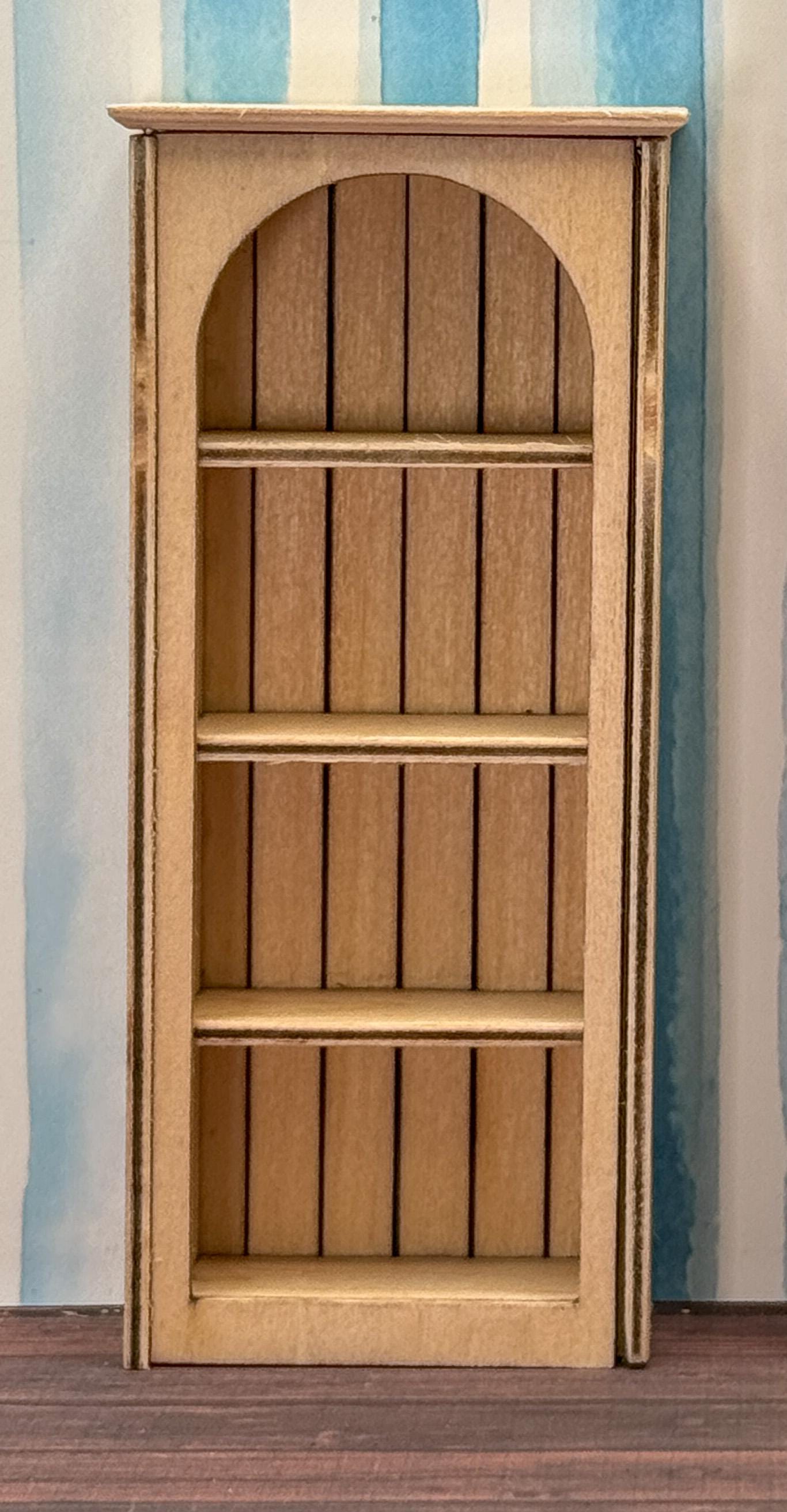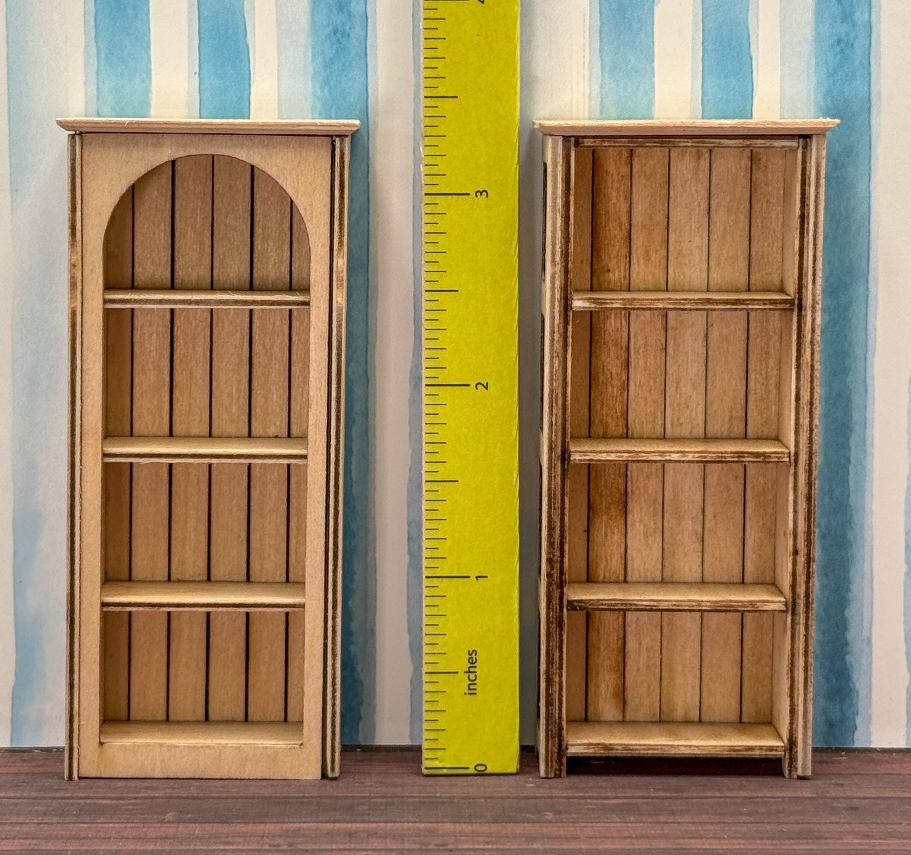 This pair of half inch scale Bookshelves come in 2 designs - Arched or Open Front. Perfect for a Perfect for any room in the house. Crate dimensions: 3 3/8 tall x 1.5 wide x 3/8 deep (inches). Tray dimensions 1/4 tall x 1.5 wide x 3/8 deep (inches)